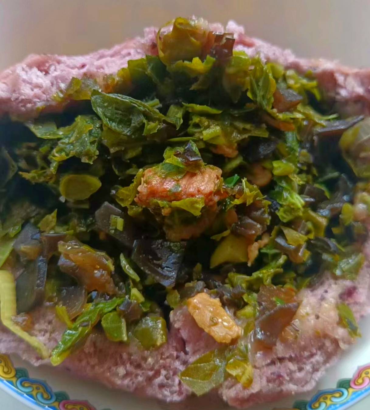 再取一把木耳泡发好后下锅焯烫一下,捞出过水后也切碎剁细,和剁细的桑葚放到一起,再倒入凉透的肉丁,加入适量的食用油和少许食盐、鸡精,用筷子充分搅拌均匀,让肉丁和桑葚的味道相互融合,这样鲜美好吃的桑葚芽包子馅就调好了。