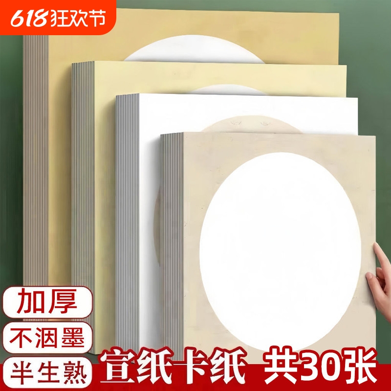 30张加厚宣纸镜片卡纸生宣熟宣半生熟国画美术写生纸工笔画圆形方形空白全白书法作品纸纸儿童画软卡纸批发