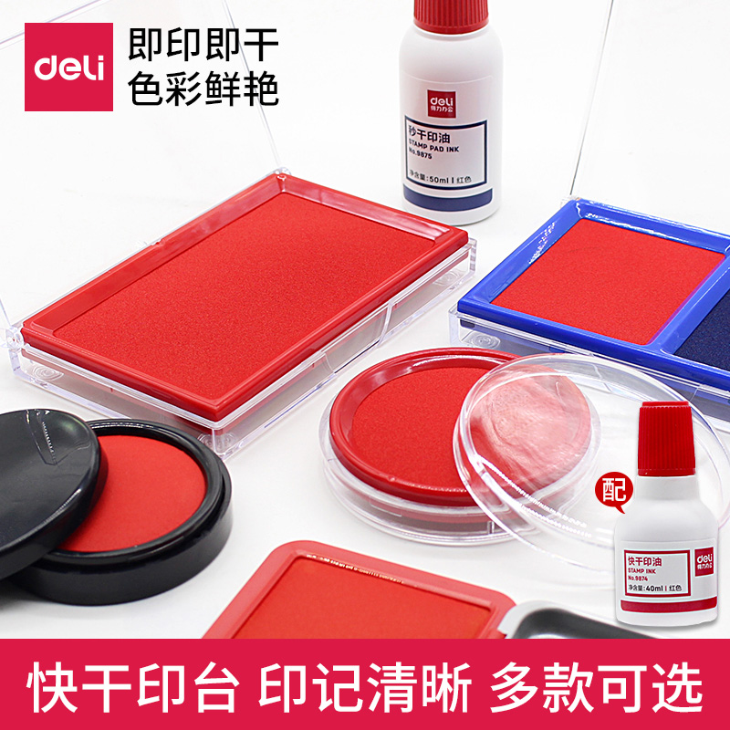 得力红色印台大号印泥铁盒快干圆形印章印油银行按手印指纹小号黑色速干方形印尼财务会计蓝色印泥油印章油