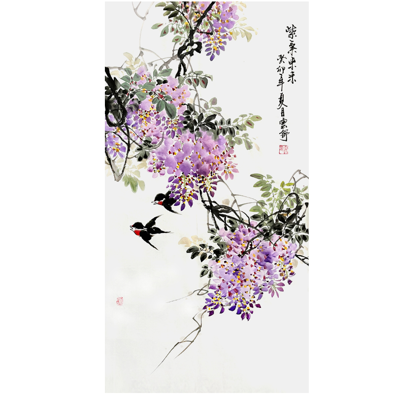 紫藤花字画入户中式玄关紫气东来装饰画国画手绘真迹走廊尽头挂画