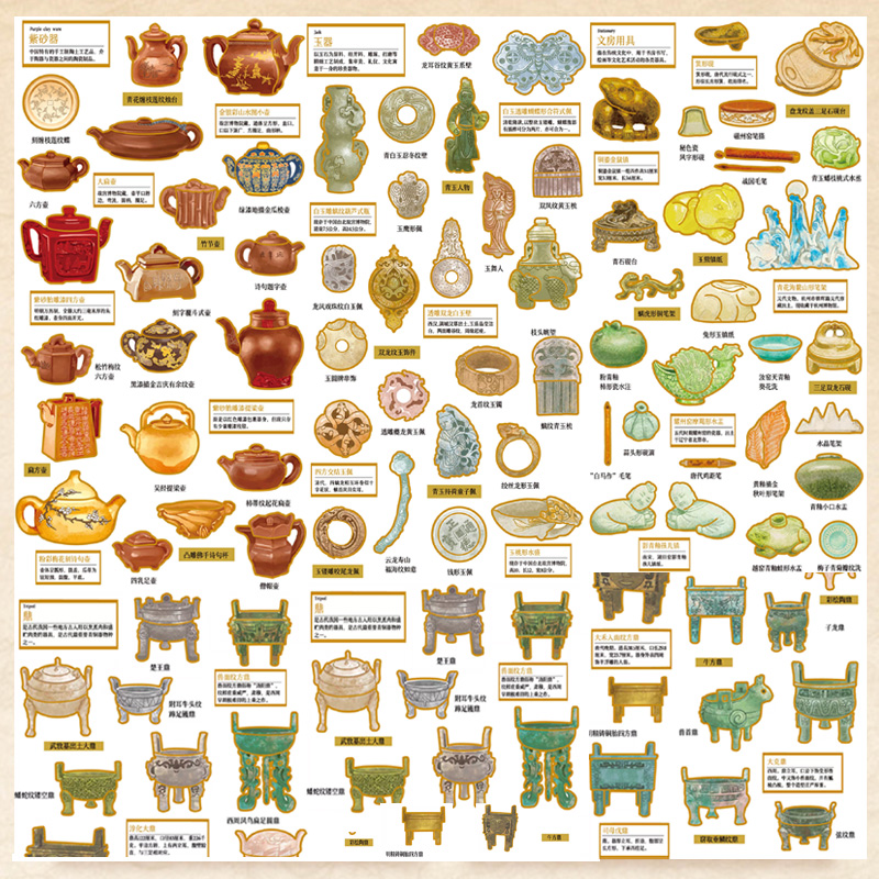 TIPETOYS国风咕卡珍宝馆文创贴纸历史文物文房用具紫砂器玉雕大鼎博物馆图文鉴赏国风复古烫金装饰笔记本桌面