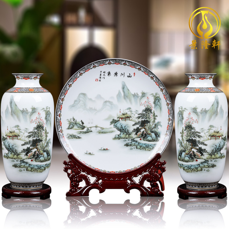 景德镇陶瓷器花瓶家居客厅摆件插花瓷瓶三件套酒柜装饰品盘工艺品
