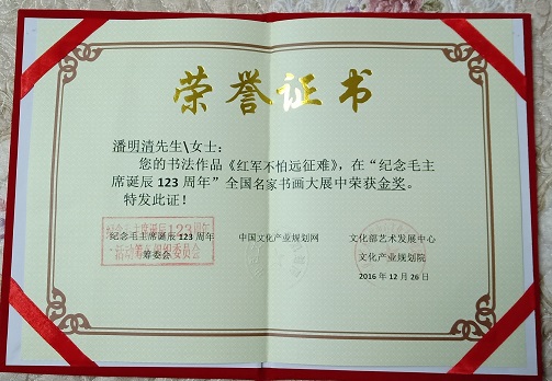 少年时代临摹毛主席书法和画像,几十年如一日,己达到炉火纯青地步,作品参加全国大型笔会,一纪念毛主席诞辰大型活动,毛体书法(沁园春,长征,满江红)获金奖,一等奖作品被人民大会堂,中央电视台,湖南省委宣传部,国家领导人,外国友人,华人华侨,毛主席身边工作过的老干部,老战士和众多喜爱毛泽东书法收藏爱好者等收藏。